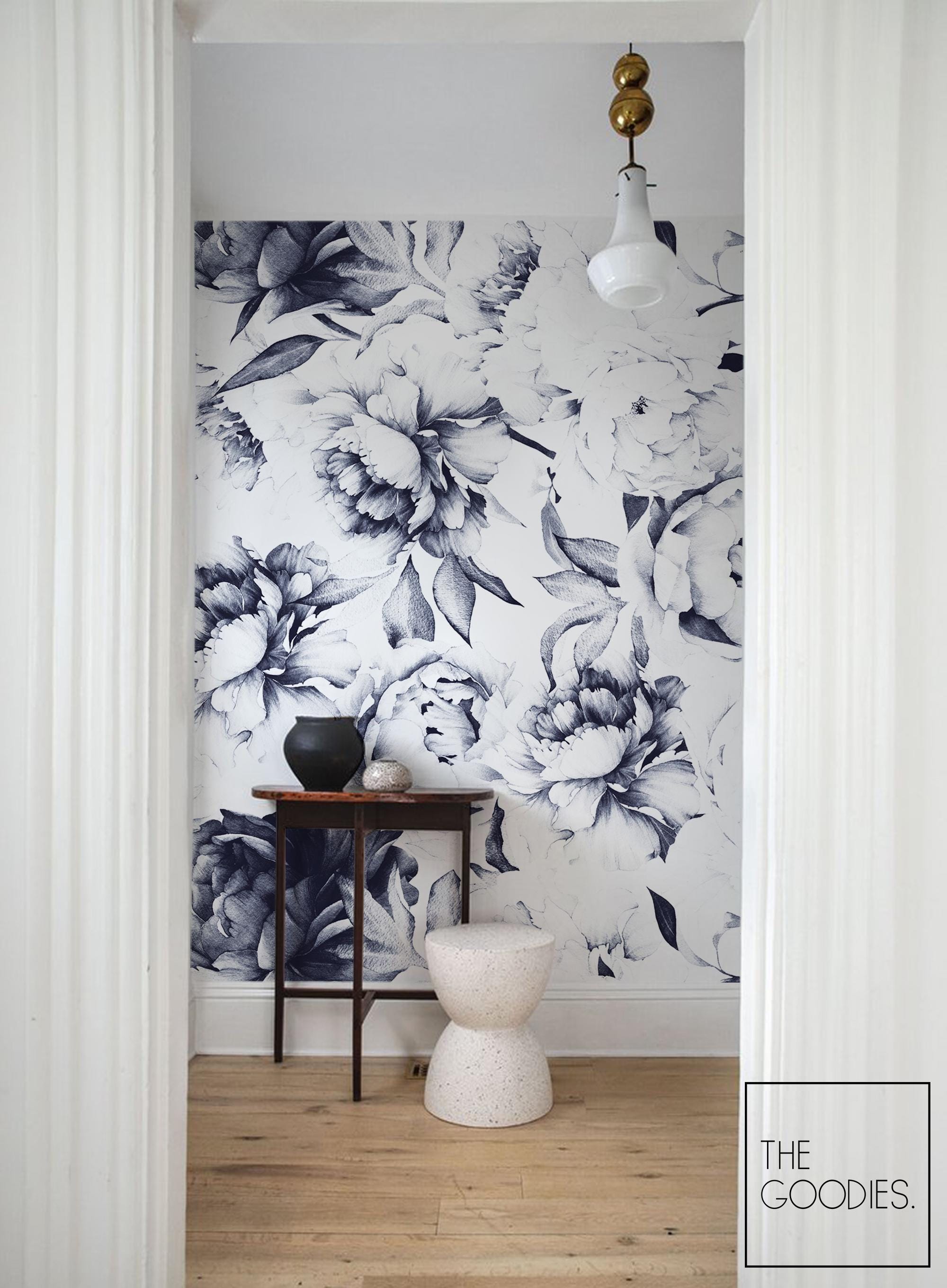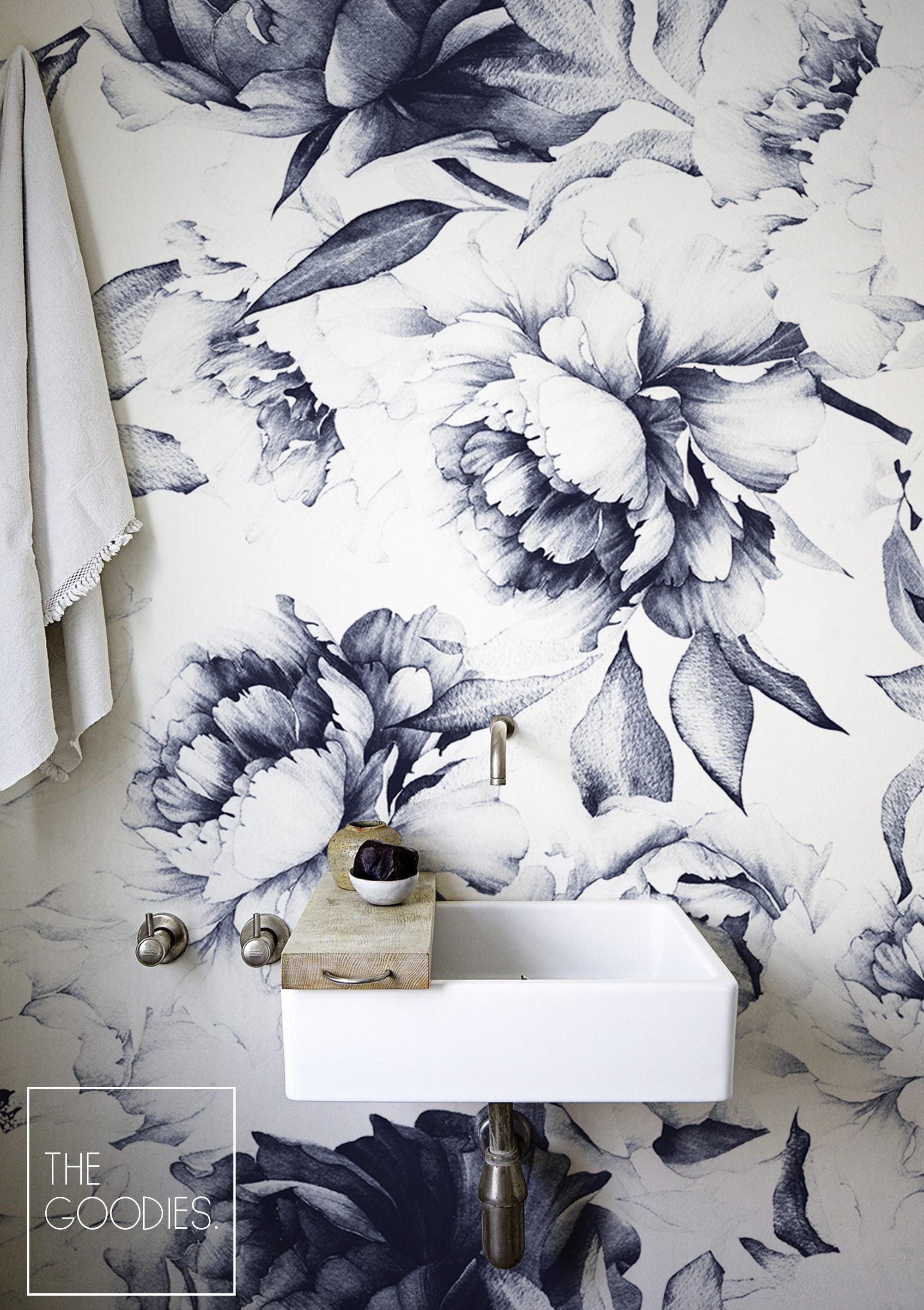 Navy Peony Wallpaper, Blue Floral wall mural, Peonies, Floral #273