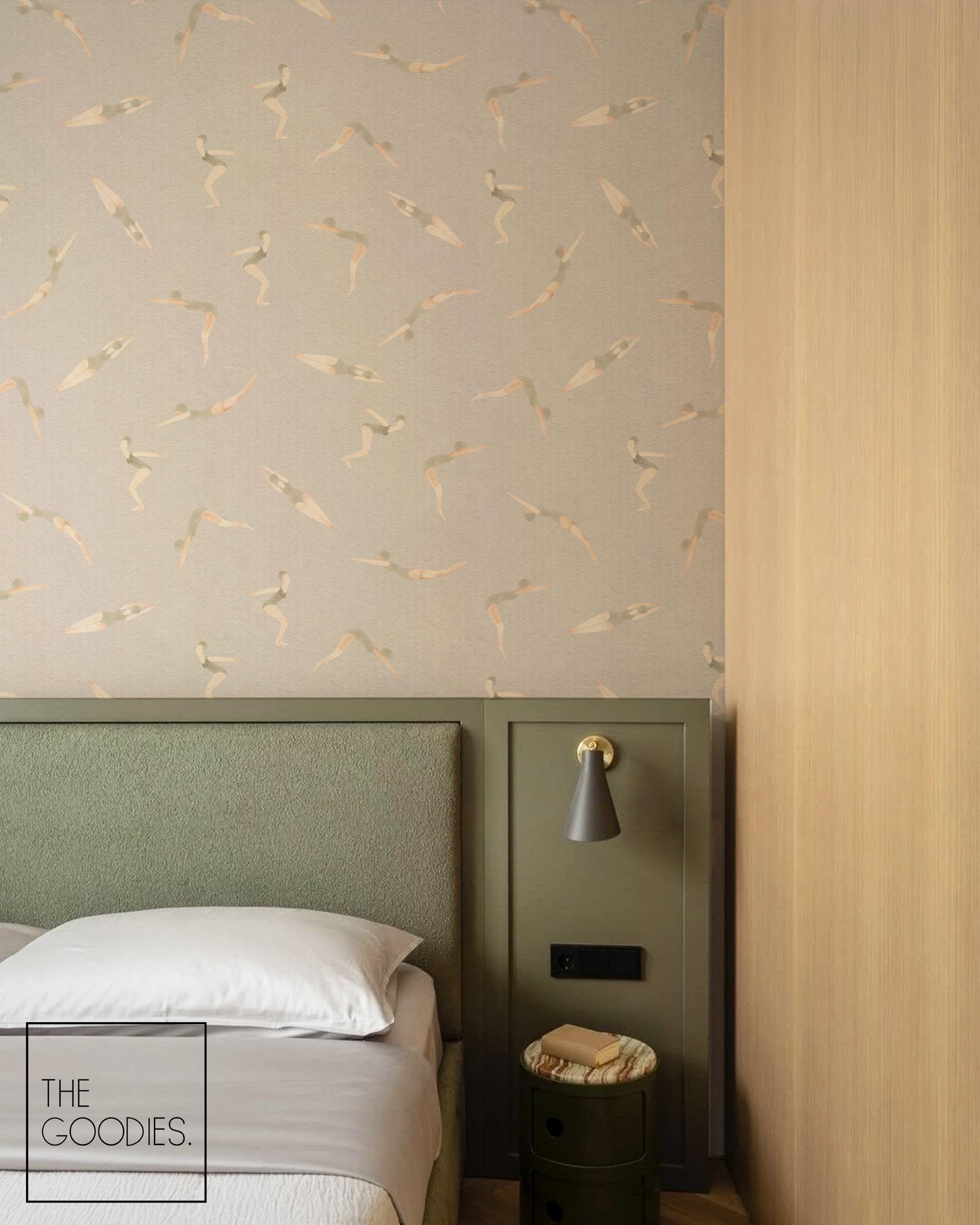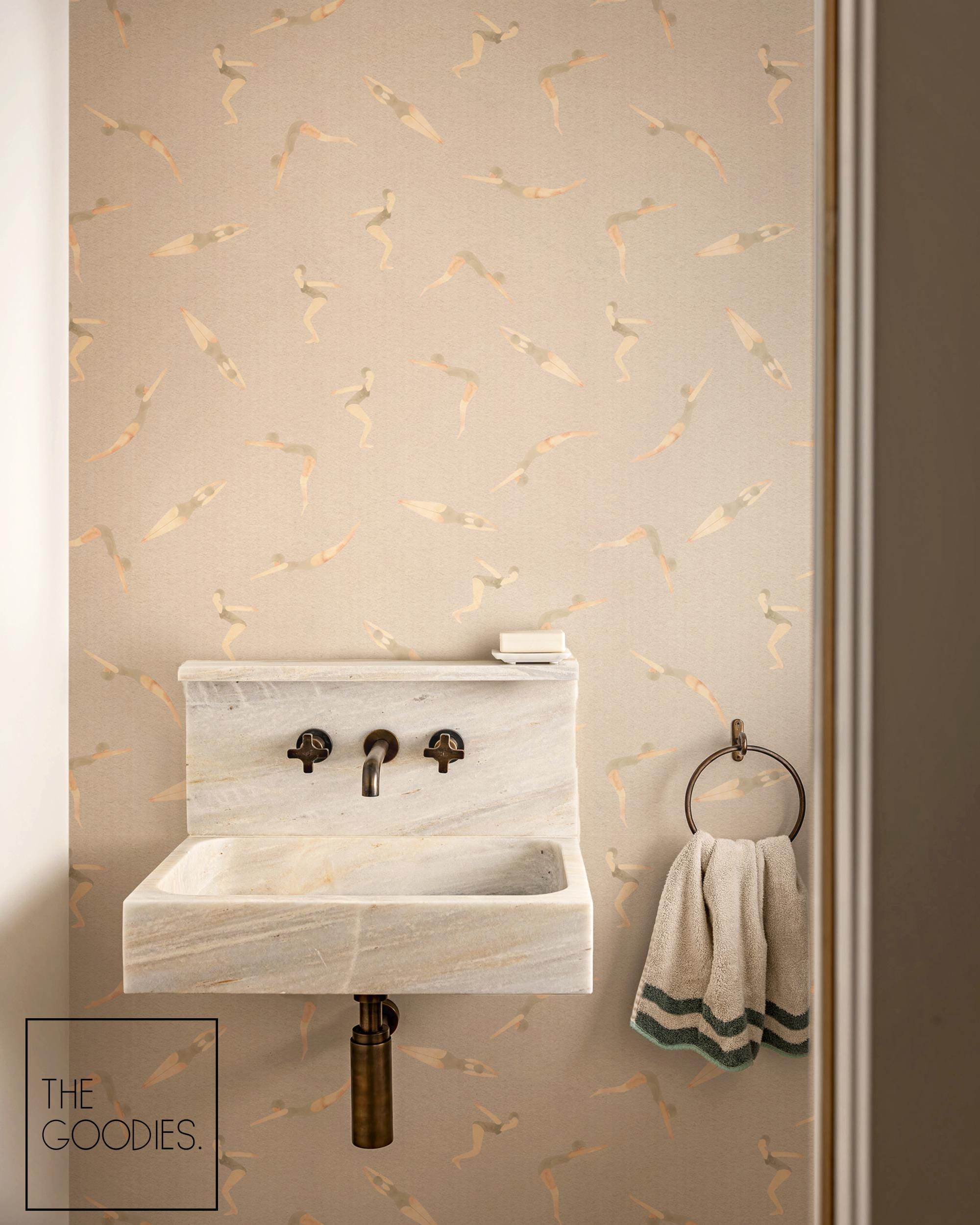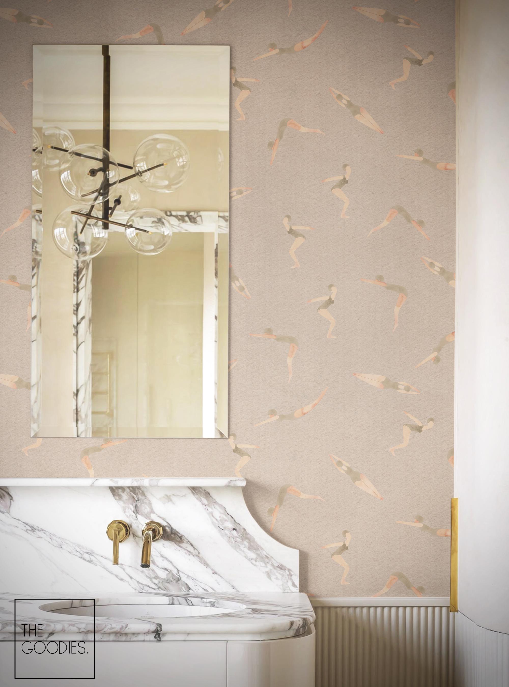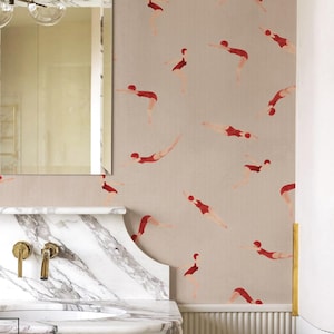 Swimmers Wallpaper, Neutral, Retro Watercolor Removable Wallpaper, Pool, Nautical Beach Decor